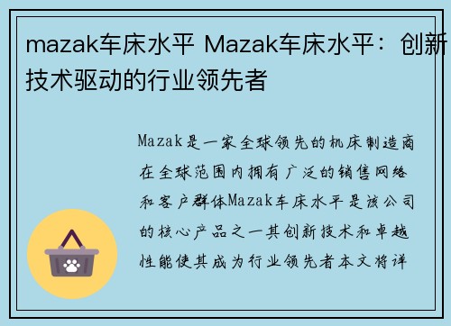Mazak是一家全球领先的机床制造商,在全球范围内拥有广泛的销售网络和客户群体。Mazak车床水平是该公司的核心产品之一,其创新技术和卓越性能使其成为行业领先者。本文将详细介绍Mazak车床水平的特点和优势。